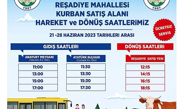 Reşadiye Mahallesi’nde bulunan kurban satış ve kesim yerine 21-28 Haziran tarihleri arasında yapılacak seferlerle kurbanlık alacak vatandaşların ulaşımları kolaylaştırılmış oluyor.
