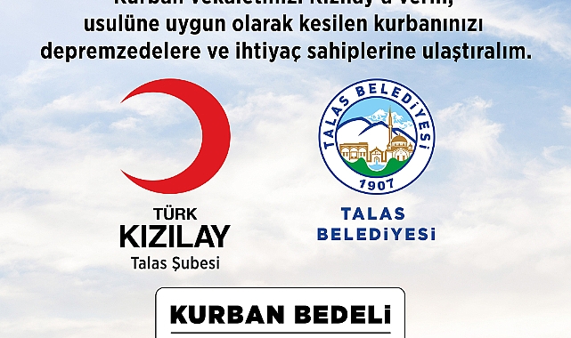 Talas Belediyesi yeni bir sosyal sorumluluk çalışmasına imza atarak Kızılay Talas Şubesi ile birlikte “Kurbanınız Sofralara Bereket Olsun" sloganıyla ihtiyaç sahipleri ve depremzedeler için kurban bağışı organizasyonu gerçekleştiriyor.