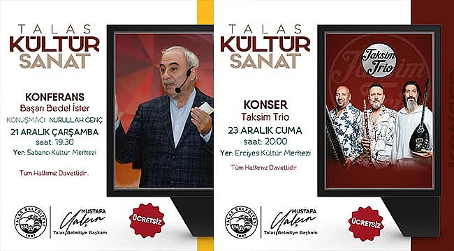 Talas Belediyesi aralık ayı kültür sanat etkinliklerinde bu hafta da yine birbirinden önemli programlar gerçekleştirilecek.