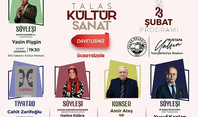 Şubat ayı Talas Kültür Sanat etkinlikleri, Yasin Pişgin söyleşisi ile start alacak. Yazar ve ilahiyatçı Yasin Pişgin’in konuşmacı olarak katılacağı “Hz. Peygamber ve Farkındalık” konulu söyleşi, 8 Şubat Çarşamba günü saat 19.30’da Erciyes Üniversitesi (ERÜ) Sabancı Kültür Merkezinde başlayacak.
