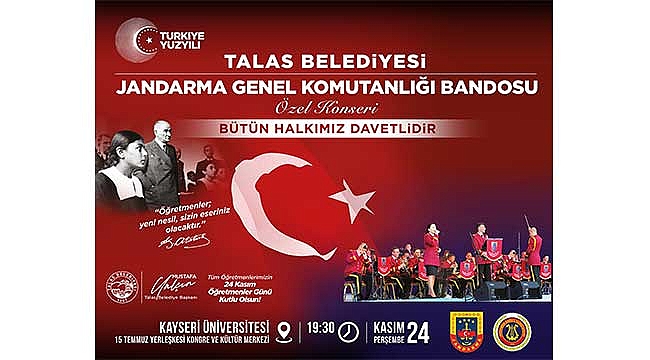 Birbirinden özel konserlerle şimdiye kadar birçok farklı şehirde konser vererek dinleyicilerin milli ve manevi duygularını kabartan Jandarma Genel Komutanlığı Bandosu, bu kez 24 Kasım Perşembe günü Talas’ta sahne alacak.