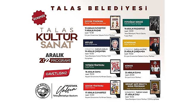 Kültür sanat faaliyetleri ile dikkat çeken Talas Belediyesinde Aralık ayı da yine dopdolu geçecek. 7’den 70’e her yaş grubuna hitap eden programlarda çocuk ve yetişkin tiyatrosundan anma programına, fotoğraf sergisinden konser ve söyleşilere kadar dolu dolu bir aylık program hazırlandı. Tüm gösteriler ücretsiz olarak sanatseverlerle buluşacak.