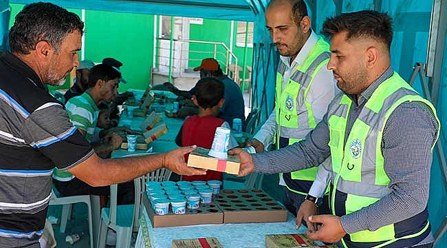 Ekinlerin biçilmeye başlamasıyla birlikte hasatlarını teslim etmek için özel silo ya da Toprak Mahsulleri Ofisi (TMO) depolarına gelen çiftçilere öğle yemekleri için kıymalı ve ayrandan oluşan kumanya dağıtılıyor.