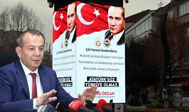Suudi Arabistan'ın başkenti Riyad'da oynaması planlanan Süper Kupa Finali'nin iptali sonrası Bolu Belediye Başkanı Tanju Özcan, kentin dört bir yanındaki elektronik billboardlarda yayınladığı görsel ile Arap yetkililere tepki gösterdi. Özcan'ın talimatı ile bilboardlara koyulan, 'Çöl faresi bedevilere, Atatürk'ün büyüklüğünü hatırlatan Fenerbahçe ve Galatasaray camiasını Bolu halkı adına kutluyorum. Atatürk'süz Türkiye olmaz' yazılı görseller, Bolu Cumhuriyet Başsavcılığı'nın kararı ile kaldırıldı. Başsavcılık ayrıca bilboardlara yansıtılan görseller ile ilgili soruşturma başlattı. 'PİŞMAN DEĞİLİM'Soruşturma sonrası Tanju Özcan, sosyal medyadan paylaşım yaparak, "Bu görsel ile ilgili soruşturma açılmış. Gerçekten akıl tutulması yaşanıyor. Türk milleti olarak biz ezik miyiz? Katil Suud rejimi tarafından, Türkiye Cumhuriyeti kurucusunun manevi hatırasına saygısızlık yapılıyor. Biz buna tepki gösterdik diye soruşturma geçiriyoruz. Pişman değilim, kimse Türk milletinin kırmızı çizgisi olan Mustafa Kemal Atatürk'e saygısızlık yapamaz" dedi.