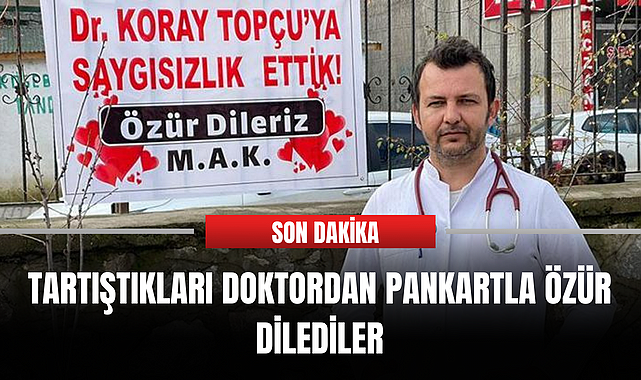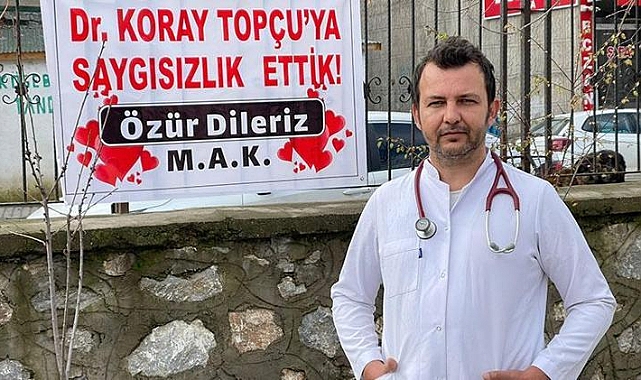Muş'un Hasköy ilçesinde bir hasta ile yakını, tartıştıkları aile hekiminden görev yaptığı Toplum Sağlığı Merkezi'nin bahçesine astıkları pankartla özür diledi. Hasköy ilçesindeki Toplum Sağlığı Merkezi’nde 21 Aralık günü aile hekimi Koray Topçu (41) ile hasta ve yakınları arasında muayene sırasında tartışma yaşandı. Tartışmanın ardından merkezden ayrılan hasta ile yakını, astıkları pankartla Dr. Topçu'dan özür diledi. Hasta ve yakını merkezin bahçe duvarındaki demir parmaklıklara 'Dr. Koray Topçu’ya saygısızlık ettik! Özür dileriz. M.A.K' yazılı pankart astı. 13 yıldır Muş’ta görev yaptığını belirten Dr. Topçu, “İzmirli olmama rağmen, çok uzun zamandır burada görev yapıyorum. Halkı ile aramız iyi. Ama arada bir böyle münferit olaylar yaşanabiliyor.Geçen hafta muayene sırasında bir hasta ve onun yakınıyla ufak çaplı bir tartışma yaşandı. Fakat ertesi gün bu kişiler yaptıklarından dolayı pişman olarak, gelip benden özür diledi. Sonrasında bir özür pankartı hazırlayarak, aile sağlığı merkezinin bahçe duvarındaki demir parmaklıklara asmışlar. Sabah gelirken gördüğüm pankarttaki yazı çok hoşuma gitti" diye konuştu. Sonrasında bizim olayımız tatlıya bağlandı. Kendi sosyal medya hesaplarımdan bu anın görüntüsünü paylaştım. Açıkçası çok güzel tepkiler de geldi. Etraftaki insanlar, değerli meslektaşlarım ve sağlık çalışanları güzel tepkiler verdiler. Temennim; sağlıkta şiddetin bir an önce çözümlenmesi yolunda ve bu hem hastalar açısından, hem sağlık çalışanları açısından mutlaka çok iyi olacaktır. En azından bu görüntüyle, bu pankartla, bu karşılıklı anlaşmayla birlikte buna da bir umut ışığı olabiliyorsak ne mutlu bize."
