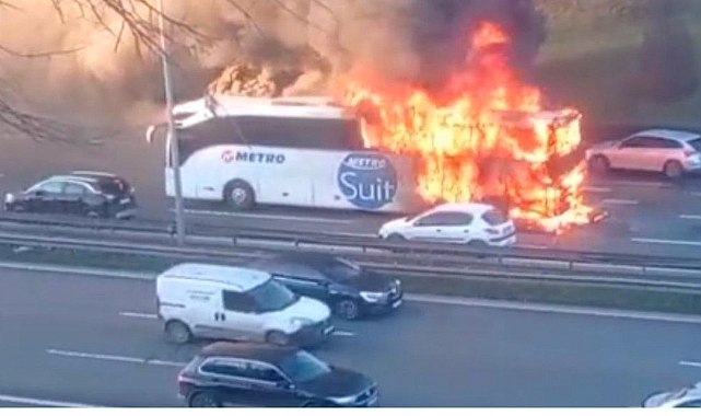 TEM Otoyolu Metris Bağlantı Yolu'nda seyir halinde olan bir yolcu otobüsü alev alev yandı. Yangın sırasında yolcuların olduğu otobüste şans eseri ölen ya da yaralanan olmadı.