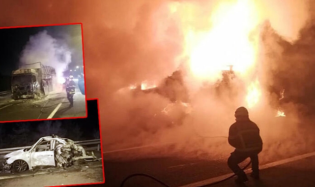 Bolu'da, Anadolu Otoyolu'nda TIR ile çarpıştıktan sonra alev alan otomobildeki çift ile 2 çocukları hayatını kaybetti, 1 çocukları ise yaralandı. TIR'daki 2 kişi de kazadan yaralı kurtuldu.