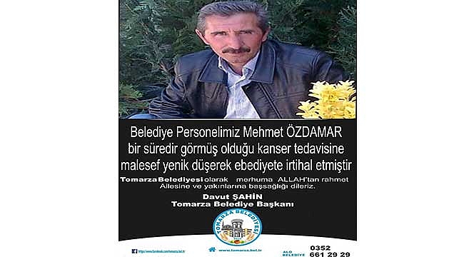 Tomarza Belediye personellerinden Mehmet Özdamar bir süredir tedavi gördüğü kansere yenik düştü. Özdamar'ın vefat haberini Tomarza Belediye Başkanı Davut Şahin, sosyal medyada yaptığı paylaşımla duyurdu. Başkan Şahin:Tomarza Belediyemiz çalışanlarından Çalışma Arkadaşımız.Abimiz Mehmet Özdamar, bir sürerdir görmüş olduğu kanser tedavisine maalesef yenik düştü.Mehmet Özdamar' Abimize Allah'tan rahmet yakınlarına ise başsağlığı diliyorum." ifadelerini kullandı.