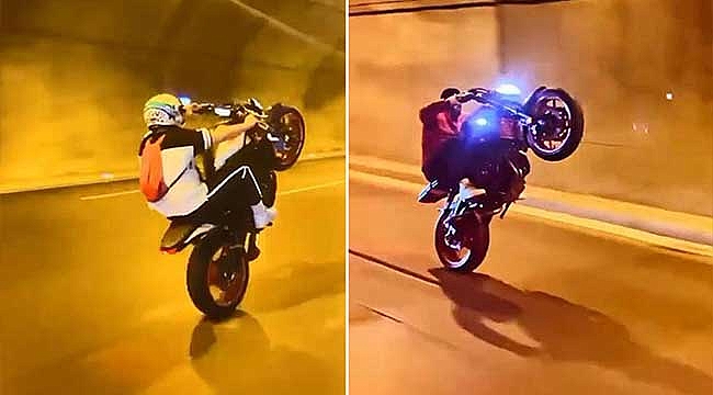 Kağıthane Tüneli’nde tek tekerini kaldırarak gitmeye çalışan motosikletli, diğer motosiklet sürücüsü tarafından kaydedildi. Uzun süre motosikletini hızla tek teker olarak kullanan kişi bir süre sonra gözden kayboldu.
