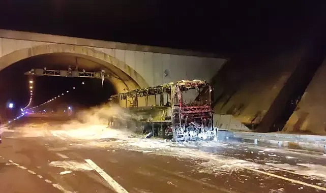 Bursa'nın Orhangazi ilçesi Gebze- Orhangazi- İzmir Otoyolu Orhangazi Tüneli çıkışında motorundan tutuşarak tamamen yanıp demir yığınına dönen işçilerin taşındığı servis otobüsü, çekici yardımı ile bulunduğu yerden kaldırıldı. Yaklaşık 2 saat trafiğe kapanan yol, otobüsün kaldırılması ve tüneldeki dumanın tahliye edilmesiyle normale döndü.