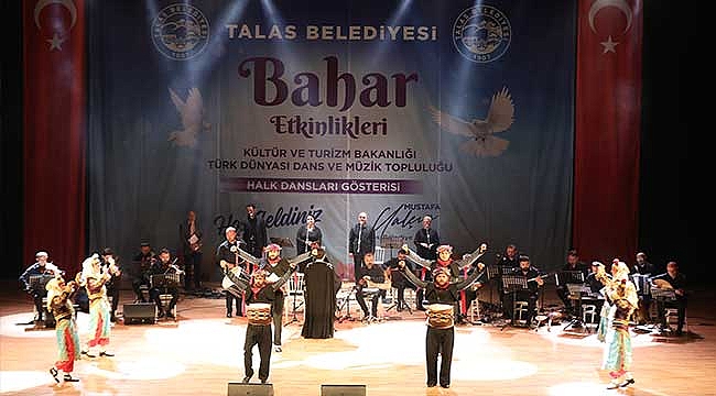 Talas Belediyesi ‘Bahar Etkinlikleri’ kapsamında muhteşem bir geceye daha imza attı. Kültür ve Turizm Bakanlığı türk dünyası Dans ve Müzik Topluluğunun sahne aldığı organizasyonda yöresel ezgiler seslendirilirken Türk dünyasına özgü figürlerle danslar ve halk oyunları sergilendi.