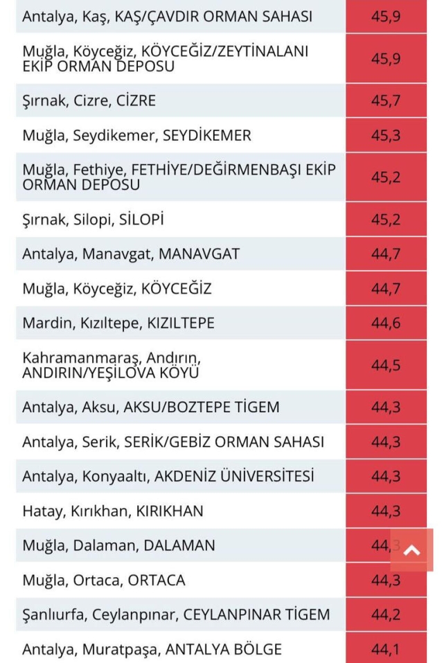 Meteoroloji Genel Müdürlüğü'nün 'yüksek sıcaklık' uyarısında bulunduğu, ülke genelinde etkili olan sıcak hava dalgası Antalya'yı da vurdu. Hava sıcaklığının 40 derecenin üzerinde seyrettiği kentte, hem şehir sakinleri hem tatilciler zor anlar yaşadı. Özellikle kalabalık görüntüsü ile dikkat çeken Konyaaltı Sahili'nde yoğunluğun az olduğu görüldü. Dün ölçülen sıcaklıklarla; Türkiye'nin en sıcak yeri, 45,9 derece ile Antalya'nın Kaş ilçesi Çavdır Orman Sahası ve Muğla'nın Köyceğiz ilçesi Zeytinalanı Ekip Orman Deposu oldu. Antalya ve Muğla'yı 45,7 derece ile Şırnak'ın Cizre ilçesi takip etti. Diğer yandan Antalya'nın Manavgat ilçesinde sıcaklık 44,7, Aksu ve Konyaaltı'nda 44,3, kent merkezinde ise 44,1 derece olarak ölçüldü. Kentte, bugün ve yarın da sıcaklığın 40 derece üzerinde seyredilmesi bekleniyor.