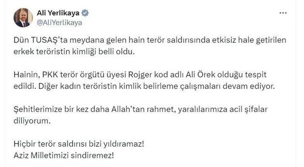 Bakan Yerlikaya, sosyal medya hesabından yaptığı açıklamada, "Dün TUSAŞ'ta meydana gelen hain terör saldırısında etkisiz hale getirilen erkek teröristin kimliği belli oldu. Hainin, PKK terör örgütü üyesi 'Rojger' kod adlı Ali Örek olduğu tespit edildi. Diğer kadın teröristin kimlik belirleme çalışmaları devam ediyor. Şehitlerimize bir kez daha Allah’tan rahmet, yaralılarımıza acil şifalar diliyorum. Hiçbir terör saldırısı bizi yıldıramaz. Aziz milletimizi sindiremez" dedi.