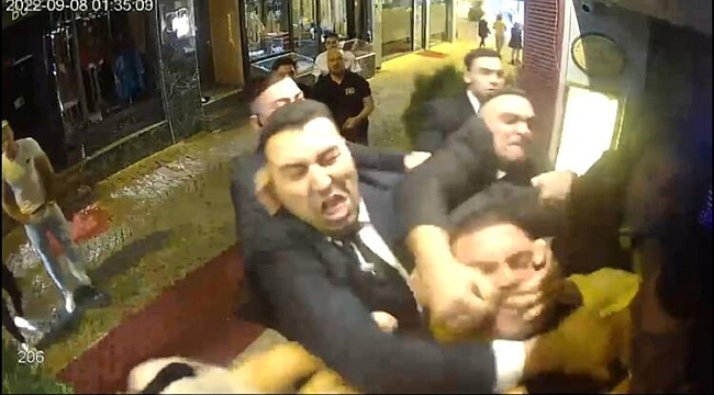 Bunun üzerine çıkan tartışmada içeri alınmayanlardan biri, güvenlik görevlilerinden birine kafa attı. Yaklaşık 10 kişi olan takım elbiseli güvenlikçiler kafa atan kişiyle birlikte yanındaki kişiyi ve kadını yere yatırıp tekme ve yumruklarla darbetti.