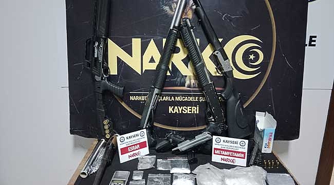 Kayseri İl Emniyet Müdürlüğü Narkotik Suçlarla Mücadele Şube Müdürlüğü ekipleri uyuşturucu madde ile mücadeleye yönelik operasyonlar gerçekleştiriyor. Bu kapsamda F.A., T.K. ve R.A. isimli kişilerin uyuşturucu madde ticareti yaptığı bilgisi üzerine harekete geçen ekipler, şüphelilerin iş yerine operasyon düzenledi. İş yerinde yapılan aramada ise 308 gram Metamfetamin uyuşturucu maddesi, 3,75 gram esrar maddesi, 1 adet uyuşturucu paketlemek için rulo folyo, 1 adet hassas terazi, 4 adet ruhsatsız tabanca ve, 4 adet ruhsatsız tüfek ele geçirildi.