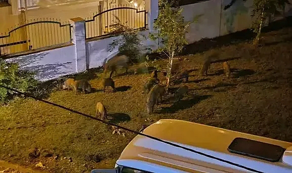 Muğla'nın Marmaris ilçesinde aç kalan yaban domuzları, yiyecek bulmak için şehir merkezine indi. O anlar, bir vatandaş tarafından cep telefonu kamerasıyla kaydedildi.