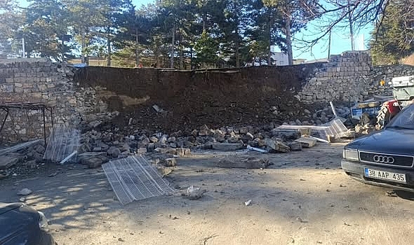 Kayseri’nin Yahyalı ilçesinde istinat duvarı, yoğun yağışların ardından gece saatlerinde çöktü.