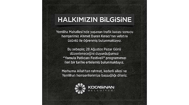Kocasinan Belediyesi’nden yapılan açıklamada şu ifadelere yer verildi: "Geçtiğimiz günlerde Yemliha Mahallesi’nde yaşanan trafik kazası sonucu 21 yaşındaki hemşehrimiz Ahmet Duran Kınacı’nın vefatını üzüntü ile öğrenmiş bulunmaktayız. Bu nedenle Kocasinan Belediyesi tarafından 28 Ağustos Pazar Günü Yemliha Mahallesi'nde düzenleneceği duyurulan ‘Yamula Patlıcanı Festivali' programımız ileri bir tarihe ertelenmiştir. Merhuma Allah’tan rahmet, kederli ailesi ve Yemlihalı hemşehrilerimize başsağlığı dileriz".