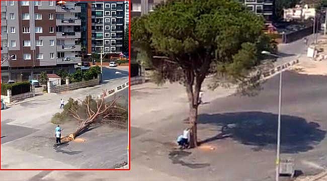 'AĞAÇ ZORUNLULUKTAN KESİLMİŞTİR'İzmir Büyükşehir Belediyesi Hemşehri İletişim Merkezi'nce konu ile ilgili sosyal medya hesabından açıklama yapıldı. Söz konusu açıklamada, "Şemikler 6286/8-6276 sokak arasında açılacak yolun ortasında kalan çam ağacının taşınmasının mümkün olmadığı anlaşılmıştır. Trafik güvenliği için Karşıyaka Belediyesi'nin başvurusu, Orman Bölge Müdürlüğü'nün onayının ardından ağaç zorunluluktan kesilmiştir" denildi.BAKAN KURUM DA TEPKİ GÖSTERDİÇevre, Şehircilik ve İklim Değişikliği Bakanı Murat Kurum, Twitter hesabından yaptığı açıklamada, "Yönettikleri hiçbir yerde yeşil yatırımı olmayan CHP yine şaşırtmadı! İzmir'de bir ağacı kurtaramayıp, katletmişler. Lafta en 'çevreci' kendileri, ama iş icraata gelince ağaçlara kıyıyorlar! Biz onları kurtarırız, yenilerini dikeriz. Siz sosyal medya belediyeciliğine devam" ifadelerini kullandı.