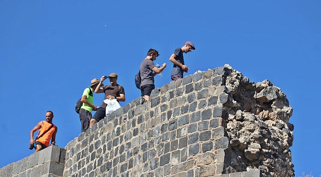 Diyarbakır'da yasağa aldırış etmeyen gençler, demir bariyerleri aşarak 12 metreyi bulan tarihi surlara çıkıp, özçekim yapıyor.
