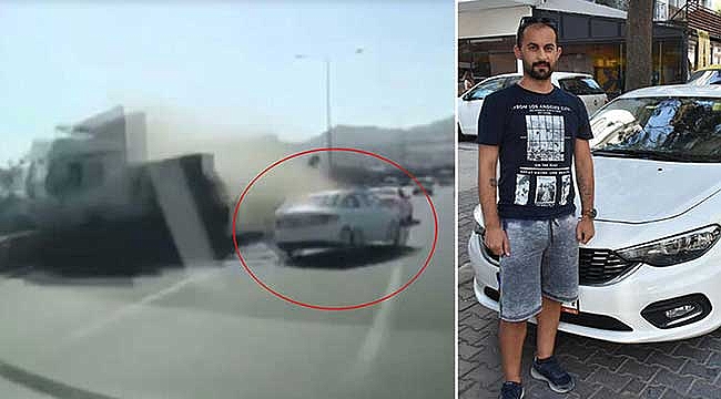 İzmir'de lastiği patlayınca bariyerleri aşarak, karşı şeride geçen TIR'ı fark eden otomobil sürücüsü Hamza Can Erdönmez (30), son anda manevra yaparak kurtuldu. Ölüm ile yaşam arasındaki ince çizgide gidip, geldiğini belirten Erdönmez, "TIR bariyere değdiği sırada hamle yaptım. TIR karşı şeride geçti. O anki refleksle 2 şerit sağa atlayarak hayatta kaldım" dedi.