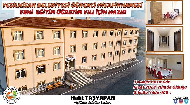2022- 2023 Eğitim Öğretim yılının hayırlara vesile olmasını dileyen Yeşilhisar Belediye Başkanı Halit Taşyapan:” Geleceğimizin teminatı öğrencilerimiz için geçtiğimiz yıl Büyükşehir Belediyemizin desteği ile misafirhanemizi 20 oda ile hizmete açmıştık. Misafirhanemizde bu yıl ise 20 odayı kız öğrencilerimiz için 14 odayı ise erkek öğrencilerimiz için hazır hale getirdik. Öğrencilerimizin eğitimlerine katkıda bulunmak adına misafirhane ücretlerinde herhangi bir artış yapmayarak geçen seneki ücretin yani 400 TL üzerinden bu yılda devam ettiğini belirtmek istiyorum. Misafirhanemiz için her alanda olduğu gibi en büyük destekçilerimiz olan Kayseri Valimiz Gökmen ÇİÇEK’e, Büyükşehir Belediye Başkanımız Dr. Memduh BÜYÜKKILIÇ’a ve Gençlik ve Spor İl Müdürlüğümüze teşekkür ve şükranlarımı arz ediyorum. Bu vesile ile öğrencilerimize yeni eğitim öğretim yılında başarılar diliyor, hayırlara vesile olmasını temenni ediyorum. “dedi.