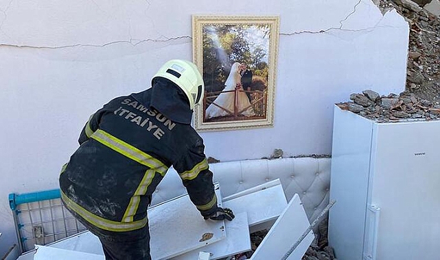 Yıkılan binanın duvarında düğün fotoğrafı asılı kaldı