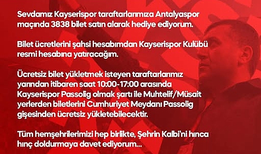 MHP Kayseri Milletvekili Mustafa Baki Ersoy'dan bu hafta oynanacak Antalyaspor maçı öncesi büyük jestSevdamız Kayserispor taraftarlarımıza Antalyaspor maçında 3838 bilet satın alarak hediye ediyorum. Bilet ücretlerini şahsi hesabımdan Kayserispor Kulübü resmi hesabına yatıracağım.Ücretsiz bilet yükletmek isteyen taraftarlarımız yarından itibaren saat 10:00-17:00 arasında Kayserispor Passolig olmak şartı ile Muhtelif/Müsait yerlerden biletlerini Cumhuriyet Meydanı Passolig gişesinden ücretsiz yükletebilecektir.Tüm hemşehrilerimizi hep birlikte, Şehrin Kalbi’ni hınca hınç doldurmaya davet ediyorum…Sen Ben Yok, Kayserispor Var