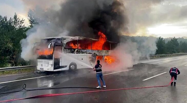 Bolu'da TEM Otoyolu'nda Trabzon'dan İstanbul'a giden yolcu otobüsü alev aldı. Yolcular kısa sürede tahliye edilirken, alevlerin sardığı otobüs kullanılamaz hale geldi.