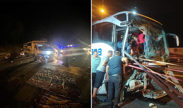 Yolcu otobüsü ile iki kamyonun karıştığı feci kazada...