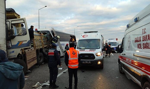 Kaza, saat 08.00 sıralarında, Konya-Afyonkarahisar kara yolu Ilgın ilçesi yakınlarında meydana geldi. Henüz plakası ve sürücüsü belirlenemeyen yolcu otobüsü, park halindeki kamyona çarptı. Kamyon da önünde park halindeki TIR'a çarptı. Kazada ilk belirlemelere göre 35 yolcu bulunan otobüsteki 2 kişi öldü, 24 kişi ise yaralandı. İhbarla bölgeye polis, jandarma, sağlık ve itfaiye ekipleri sevk edildi. Olayla ilgili inceleme sürüyor.ÖLÜ SAYISI 3'E YÜKSELDİKonya Valiliği, yolcu otobüsünün kamyona çarptığı kazada ölü sayısının 3, yaralı sayısının ise 33 olduğunu açıkladı. Açıklamada, ''Afyonkarahisar istikametinden Konya istikametine seyir halinde olan bir yolcu otobüsünün bugün saat 07.50 sıralarında Ilgın ilçesinde bir kamyona arkadan çarpması sonucu meydana gelen kazada ilk belirlemelere göre 3 vatandaşımız hayatını kaybetmiş, 33 vatandaşımız da yaralanmıştır. Olay yerine ivedilikle 112 Acil Servis, itfaiye, AFAD, jandarma ve polis ekipleri sevk edilmiştir. Yaralı vatandaşlarımız çeşitli hastanelere nakledilerek tedavi altına alınmıştır. Kaza ile ilgili soruşturma başlatılmıştır'' denildi.