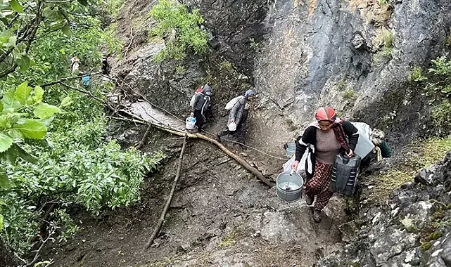 8 çocuk annesi Hanife Kartal (50), sabahın erken saatlerinde uyanıp yaylaya gittiklerini belirterek, "Her yıl bu zamanlarda yaylaya çıkıyoruz. Burada küçükbaşlarımızın süt sağımını yapıyoruz. Peynir, yoğurt, tereyağını yapıyoruz. Hem ev için yapıyoruz hem de süt ve ürünlerini satıp çocuklarımızın eğitim masraflarını ve ev ihtiyaçlarını karşılıyoruz. Her gün dağlık ve engebeli yolları geçip koyunlarımızı sağlamaya gidiyoruz. Zor ama yıllardır böyle. Koyunlarımızın bulunduğu alanda 500 metrelik yol engebeli olduğu için kendi imkanlarımızla odun, tahta parçaları ve elektrik telleriyle uçuruma düşmemek için patika yol yaptık. Tellere tutunarak zorlu kısmını tek sıra halinde geçiyoruz. Çok tehlikeli. En ufak bir harekette buradan dereye düşebiliriz. Dönüş yolculuğumuzda erkekler yardım ediyor. Zor bir yol ve yetkililerden bu yolun bu kısmının yapılmasını istiyoruz" dedi.
