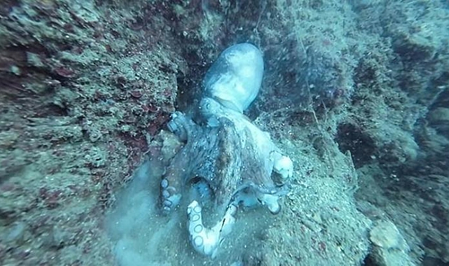 Akdeniz Üniversitesi Su Ürünleri Fakültesi'nden Prof. Dr. Mehmet Gökoğlu, öğrencileriyle sık sık Konyaaltı Sahili'nden dalış yapıp kıyının durumuyla ilgili rapor düzenliyor. Denizanalarının göç döneminde olması nedeniyle dalış yapıp göç yollarını raporlamak isteyen Prof. Dr. Gökoğlu, Konyaaltı Sahili açıklarında 10-15 metre derinlikte bir kayanın oyuğundaki ahtapotu yanındaki kamerayla görüntüledi. Kayanın kovuğunda çok sayıda yumurtası olan anne ahtapotun yumurtaları korumak için uzun süre hiç kıpırdamadan beklediğini görüntüleyen Prof. Dr. Gökoğlu, bir başka ahtapotun gelip anne ahtapotu yediği anları kaydetti. 'YUVAYI DAĞITMIŞ'