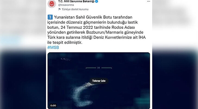 Bakanlıktan yapılan açıklamada, "Yunanistan Sahil Güvenlik Botu tarafından içerisinde düzensiz göçmenlerin bulunduğu lastik botun, 24 Temmuz 2022 tarihinde Rodos Adası yönünden getirilerek Bozburun Marmaris güneyinde Türk kara sularına itildiği Deniz Kuvvetlerimize ait İHA ile tespit edilmiştir" ifadelerine yer verildi. Genel
